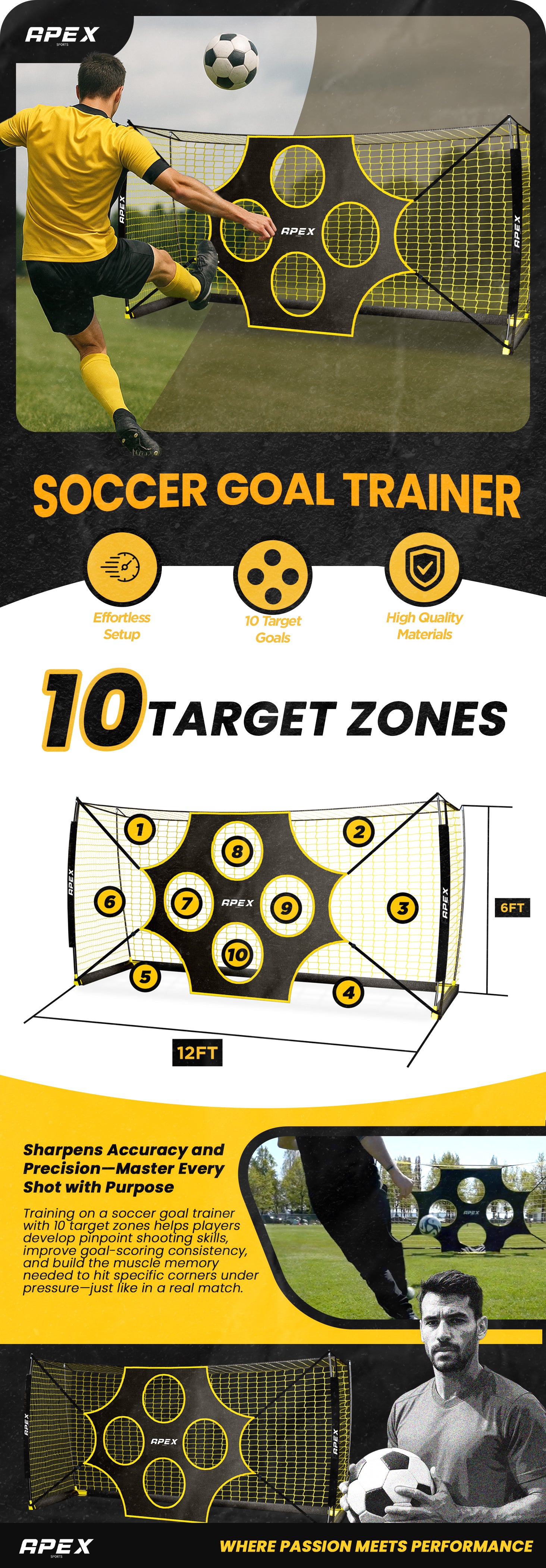 The Apex 12x6 ft soccer goal features a durable, collapsible metal frame and high-tension netting built to handle powerful shots and daily backyard training. Perfect for practicing with friends or developing precision and technique at any skill level.