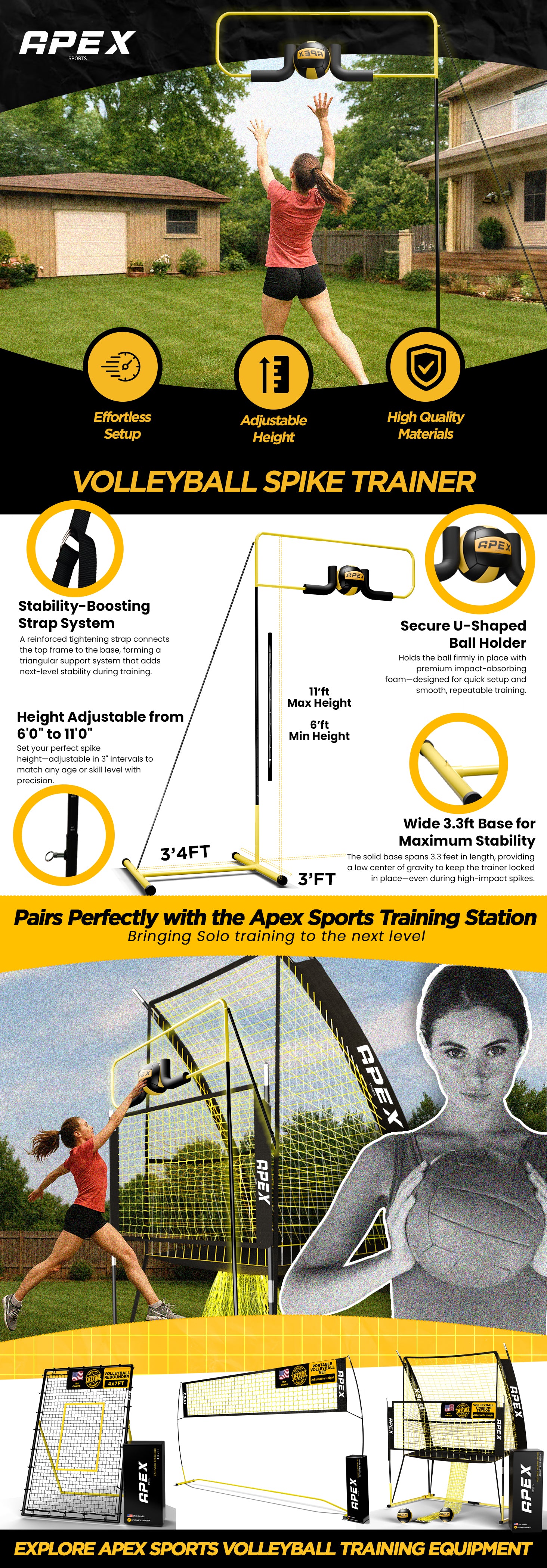 Train like a pro without needing a partner. The Apex Spike Trainer lets athletes sharpen spiking form, timing, and technique with unlimited reps in the backyard, gym, or garage. Ideal for players looking to build real, game-ready improvement through consistent solo practice.